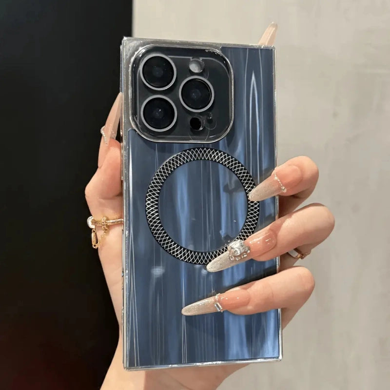 Bold square silhouette with electroplated gloss — precise, edgy, and full of style.
