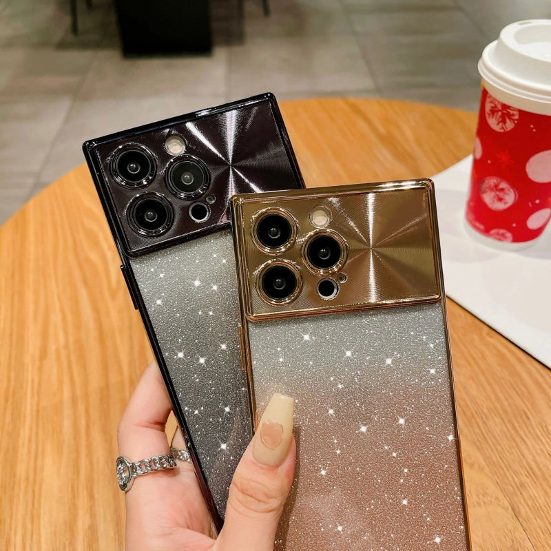 Gradient glitter iPhone case with bold square edges and a brushed CD-texture lens ring.