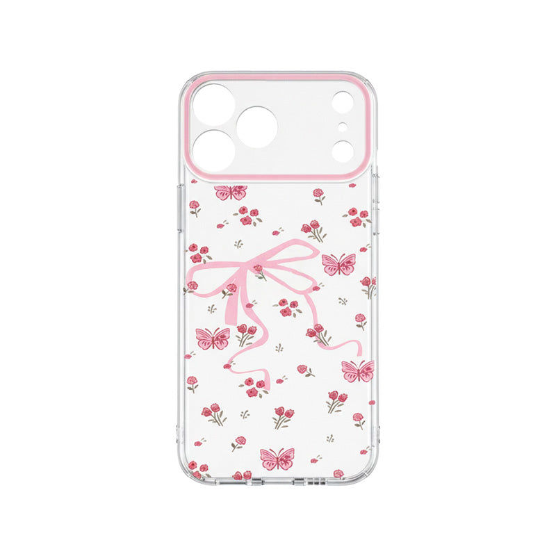 A crystal-clear butterfly case with a cloud-like touch, wrapped in blooming florals and fluttering bows. Protective yet stylish—always easy to match with your everyday look.