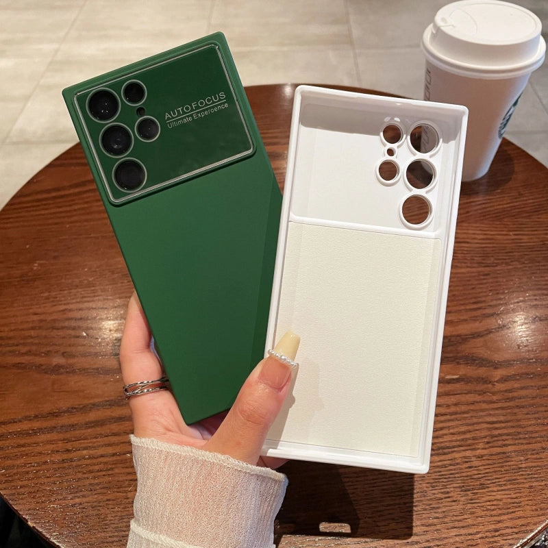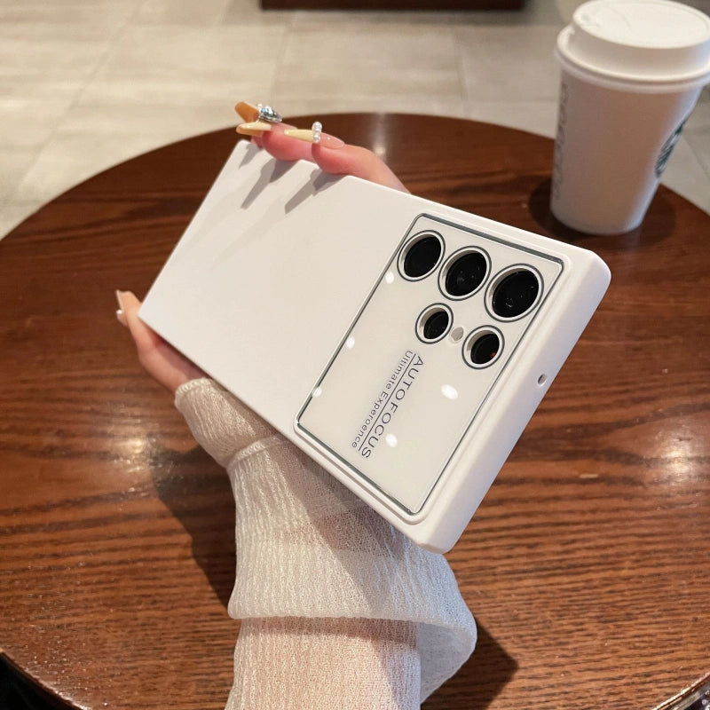 Bold frame, oversized lens window — a full-protection Samsung case with matte silicone finish, complete camera guard, and a minimalist, confident silhouette.