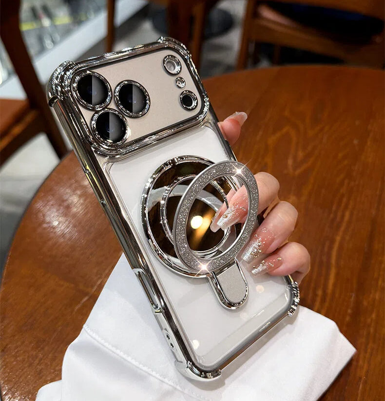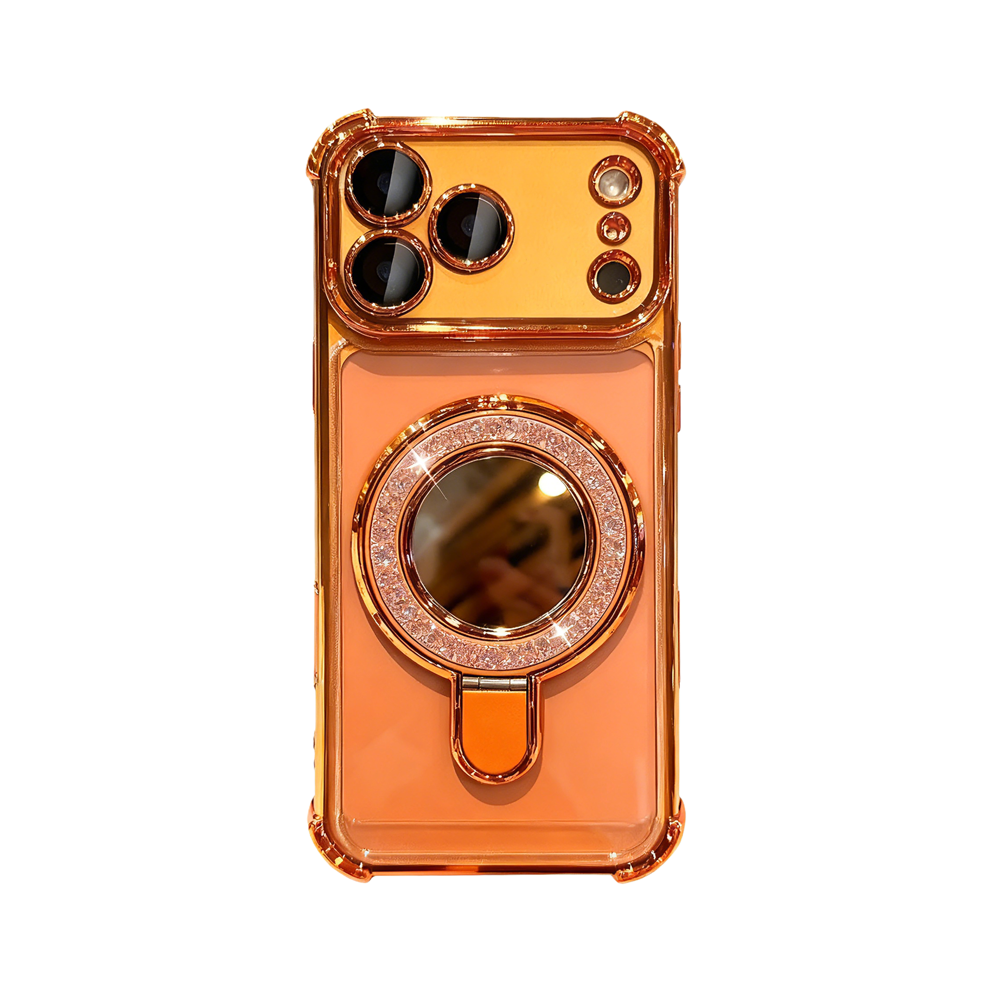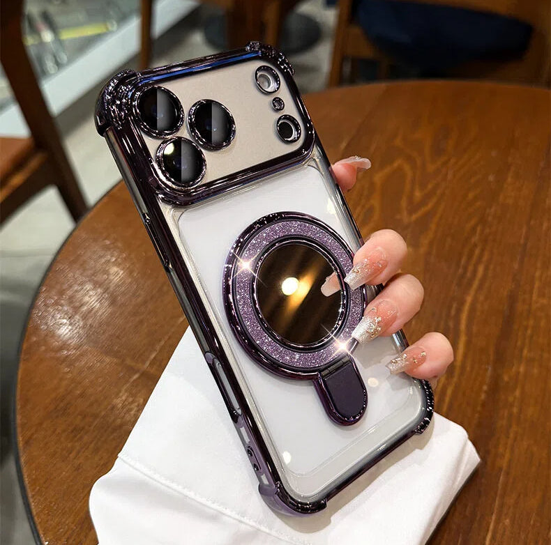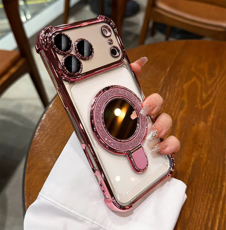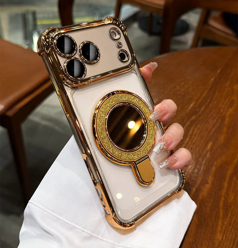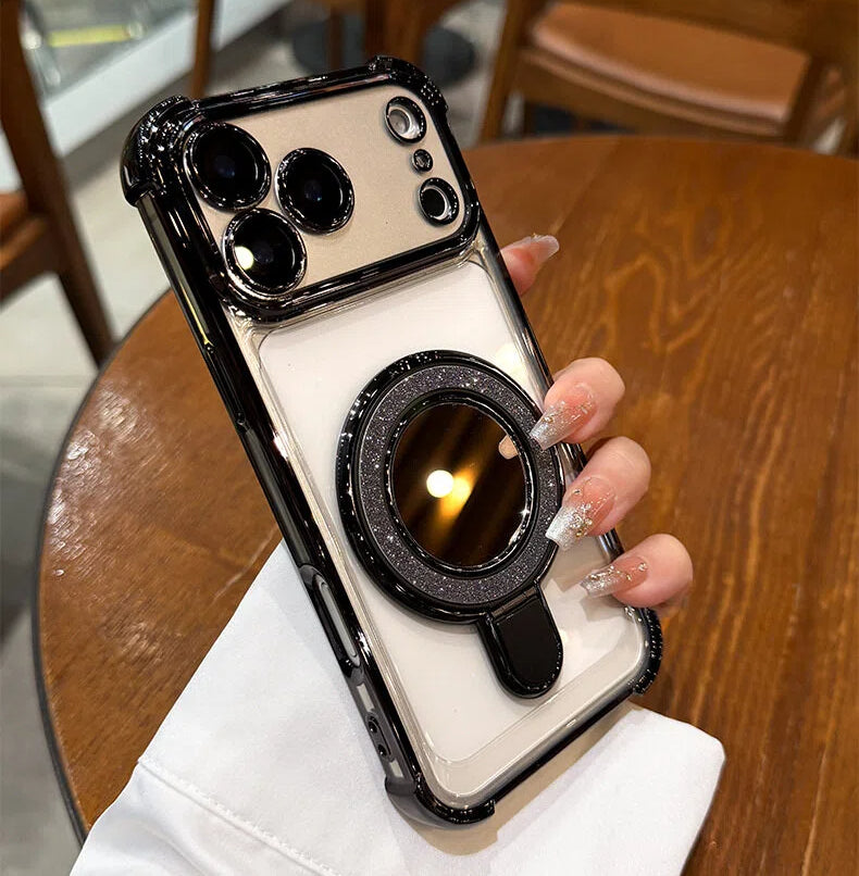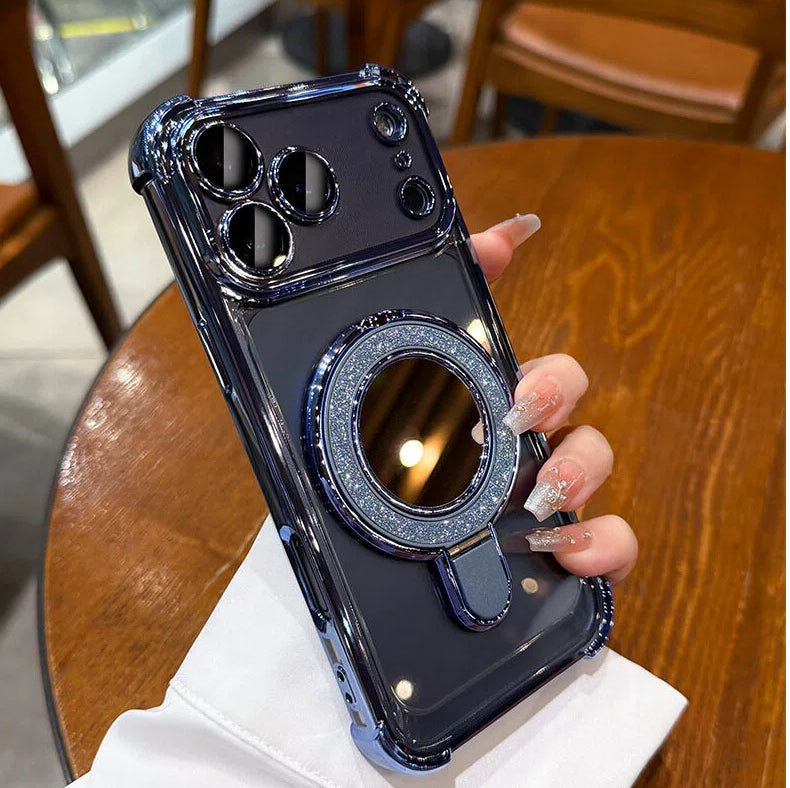Sparkle Mirror MagSafe Case for iPhone 17 / 16 / 15 — Shockproof Airbag Corners, Glitter Ring Stand, Makeup Mirror Back Cover